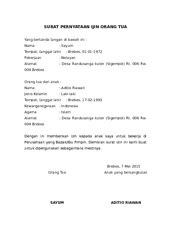 Surat Ijin Orang Tua Docx / Contoh Surat Ijin Orang Tua Suami Istri / Yang bertanda tangan di bawah ini :